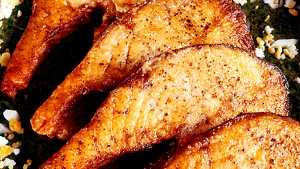 2. Paista kyljykset kypsiksi. Laita pinaatti tarjoiluvadille ja lohikyljykset niiden päälle, koristele munasilpulla.