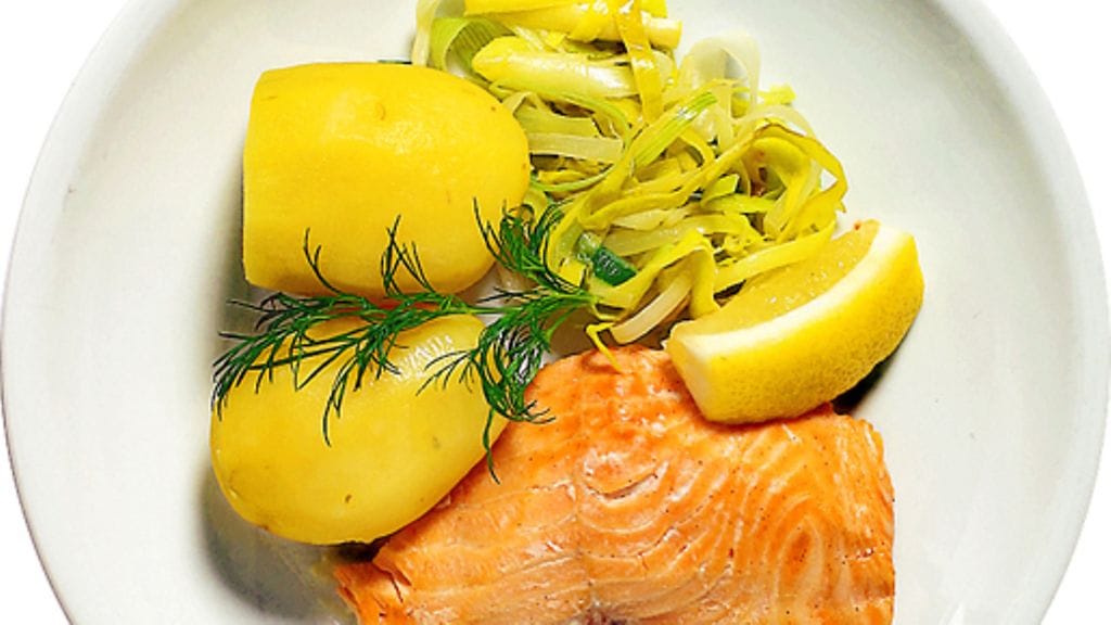 3. Tarjoile lohiviipaleet purjopedillä keitettyjen perunoiden kera. Koristele annokset tillillä ja sitruunalla.