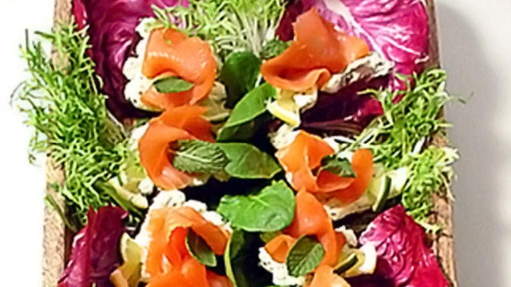 2. Pursota juusto leiville. Laskosta lohiviipaleet päälle. Tarjoile leivät rosésalaattipediltä.