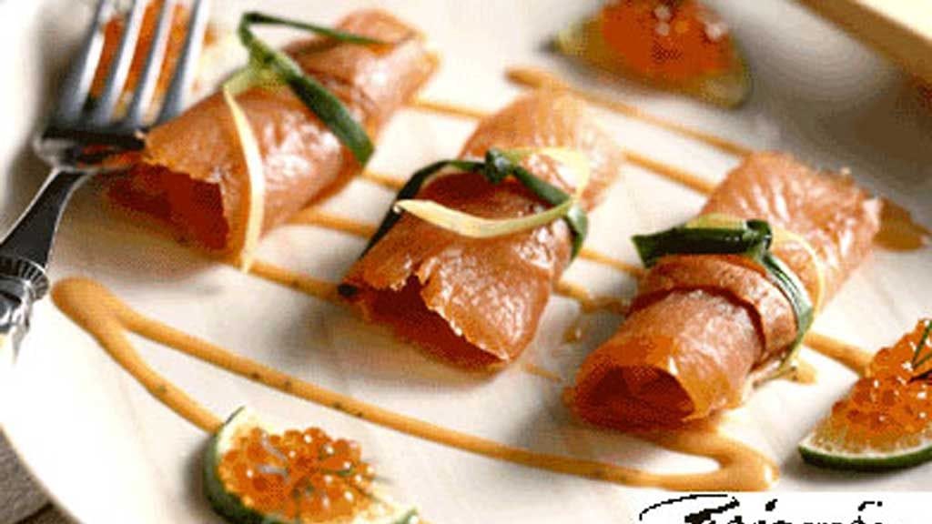 Tee lohiviipaleista pieniä rullia. Leikkaa purjosta ohuita nauhoja, joilla sidot lohirullat kiinni.