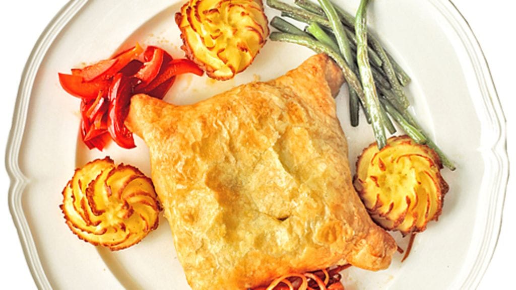2. Kuumenna uuni 225 asteeseen. Kauli voitaikina ja jaa neljään osaan. Pane pinaattia taikinapalan päälle alimmas ja sen päälle lohiviipale. Päällystä lohi tuorejuustolla. Taita taikina paketiksi ja aseta sauma alaspäin leivinpaperilla päällystetylle uuninpellille. Vatkaa kananmuna ja sivele sillä paketit. Paista uunissa noin 15 minuutin ajan.