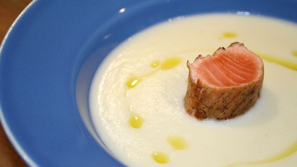 Ota fileerullat pakastimesta puoli tuntia ennen tarjoilua. Poista kelmut ja leikkaa 2 cm:n paloiksi. Kuumenna lohipaloja vajaa minuutti 180-asteisessa uunissa ja nosta maa-artisokkakeiton päälle keittolautasille.