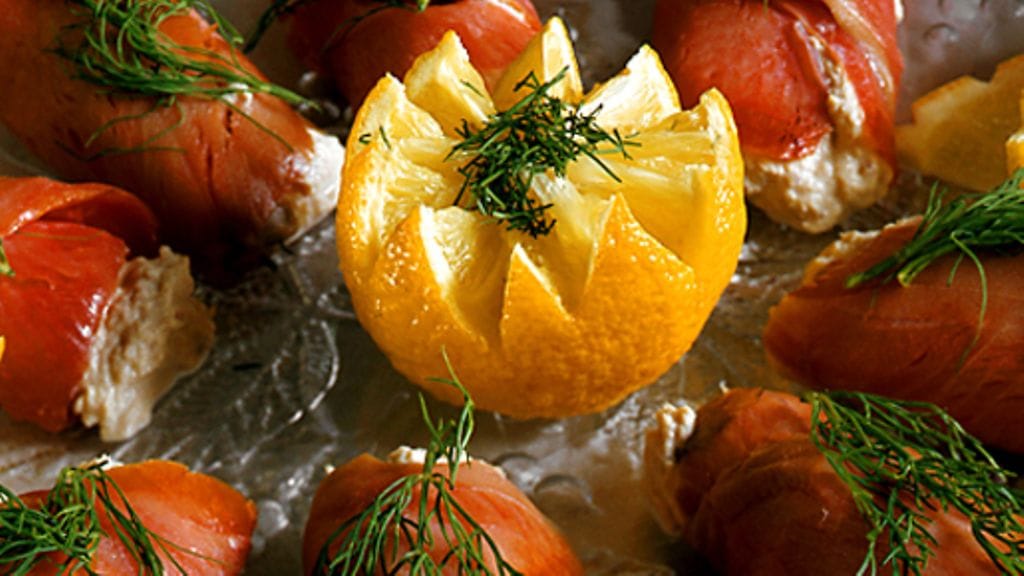 2. Laita lohiviipaleet leikkuulaudalle ja levitä päälle täytettä juuri ennen tarjoilua, jotteivät lohiviipaleet kuivu. Kääri ne rullalle ja aseta tarjoiluvadille. Koristele tillillä ja sitruunalla.