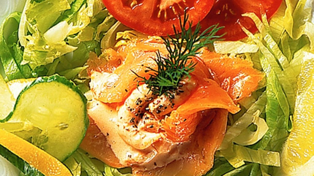 2. Jaa suikaloitu salaatti neljälle lautaselle. Kierrä lohiviipaleet yksitellen sormen ympäri ruusuiksi. Aseta ruusut salaattipedille.