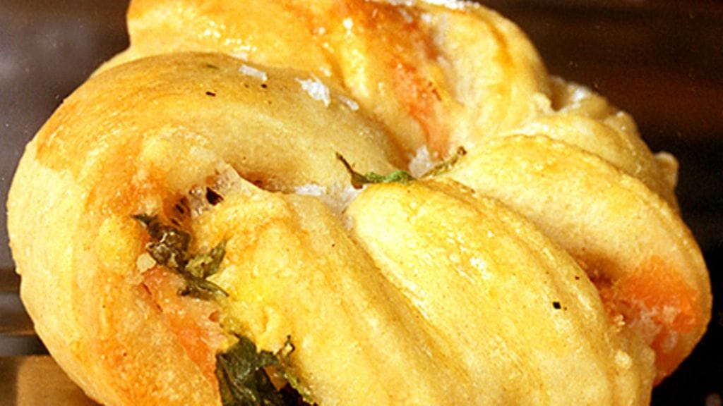 2. Leikkaa sentinlevyisiä suikaleita ja pyöräytä ne solmuiksi. Asettele solmut uunipellille leivinpaperille ja voitele ne vispatulla munalla. Paista noin 15 minuuttia tai kunnes solmut ovat kauniin värisiä.