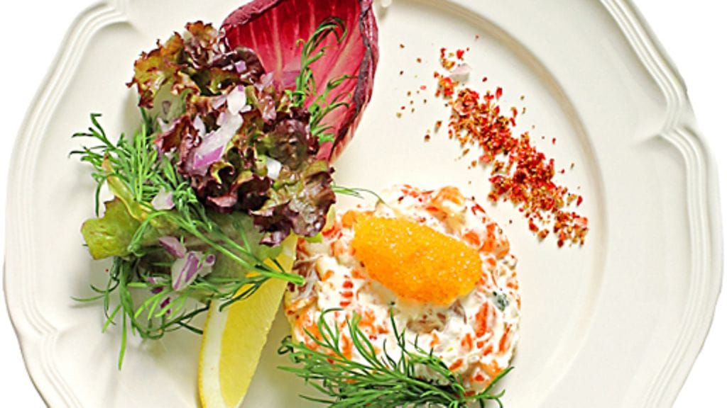 2. Muotoile seoksesta pyöreitä kiekkoja lusikoiden avulla. Asettele salaatinlehdet neljälle lautaselle, lohitartaria päälle, koristele muikunmädillä, tillillä ja sitruunalla.