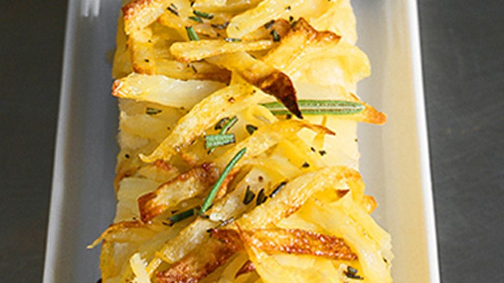 1. Kuumenna uuni 175 asteeseen. Kuori ja viipaloi perunat. Kuori ja suikaloi sipuli, paista se kullankeltaiseksi voissa. Voitele uuninkestävä vuoka.