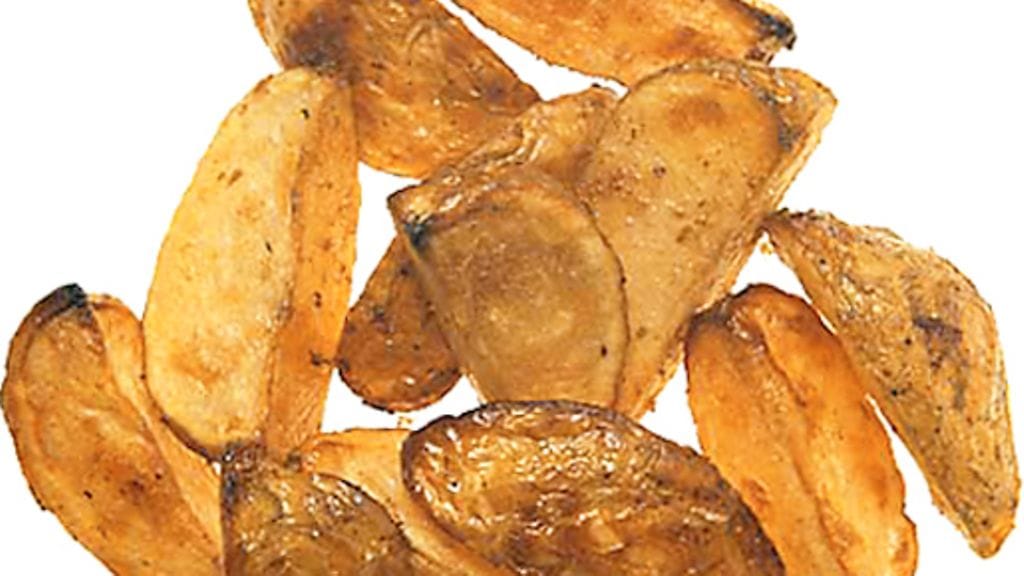 1. Kuumenna uuni 225 asteeseen. Harjaa ja kuivaa perunat hyvin ja leikkaa ne tasaisen kokoisiksi lohkoiksi kuorineen. Laita lohkot kylmään veteen heti leikattuasi, jotteivät ne tummu. Kun olet lohkonut kaikki perunat, kaada vesi pois ja kuivaa perunat puhtaalla keittiöpyyhkeellä.