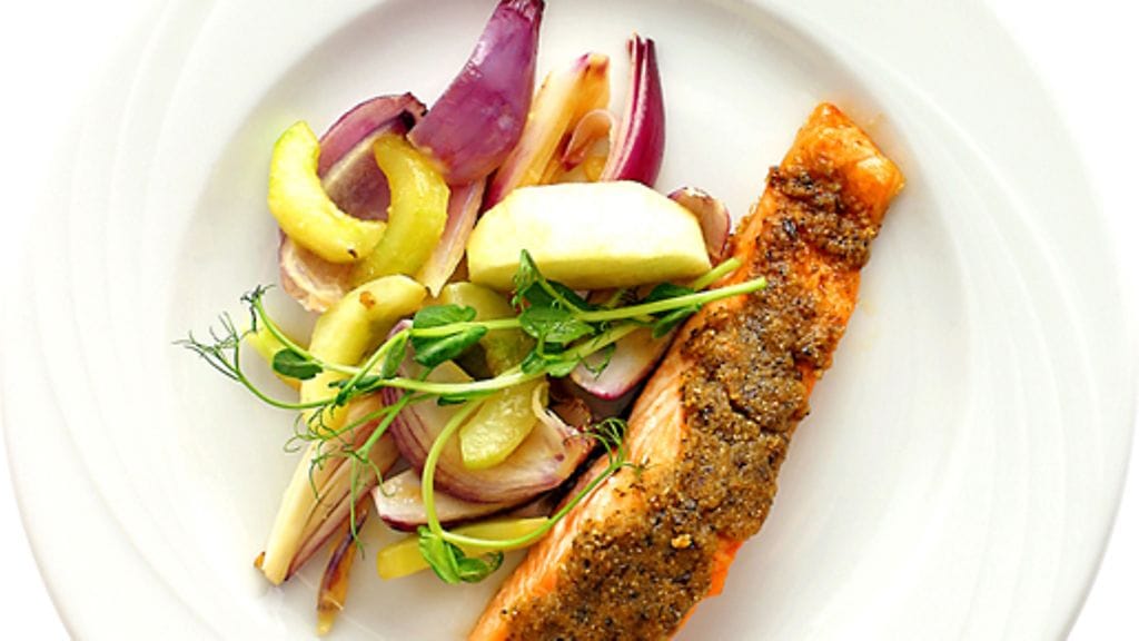3. Vihannekset: Kuori ja puoli kurkku pituussuunnassa. Rapsuta pois siemenet ja paloittele kurkku viistottain. Poista siemenkodat omenista ja leikkaa lohkoiksi. Kuori ja lohko punasipulit. Kuullota kurkku ja punasipuli pienessä määrässä voita, lisää muutaman minuutin kuluttua omenalohkot. Älä kuullota liian pitkään - niiden on tarjoiltaessa oltava al dente. Tarjoile välittömästi lohen kanssa.