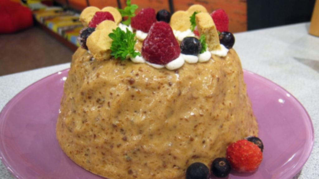 Laita vanukas kumottaviin annosvuokiin tai rengasvuokaan. Anna hyytyä seuraavaan päivään. Kumoa ja tarjoa raikkaan marjakastikkeen sekä rapean keksin kera.