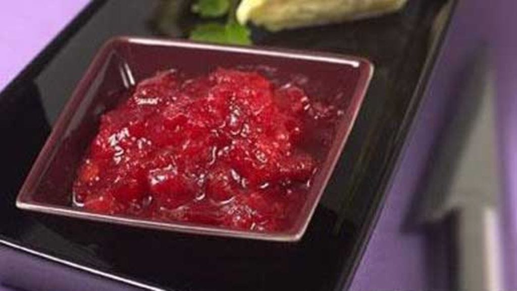 Kaada tilkka vettä kattilan pohjalle ja lisää kaikki muut aineet paitsi viinietikka. Keitä kunnes ainekset ovat soseutuneet. Lisää etikka, poista kanelitanko ja kaada sose säilytysastiaan.