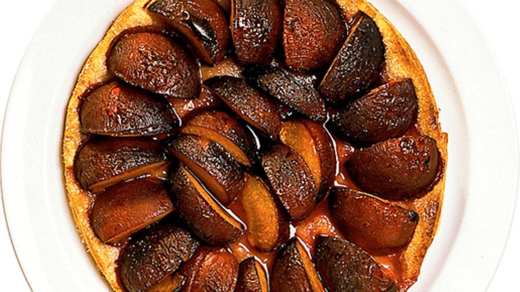 2. Leikkaa taikinasta halkaisijaltaan noin 28 cm ympyrä. Siirrä varovasti taikina leivinpaperilla pellille ja tee siihen reikiä haarukalla. Aseta luumupalat kuori ylöspäin taikinalle. Aloita noin 2 cm reunasta ja jatka ympyröitä sisään päin keskelle asti. Sirottele päälle sokeri. Tähän asti voit valmistaa tarteletin etukäteen.