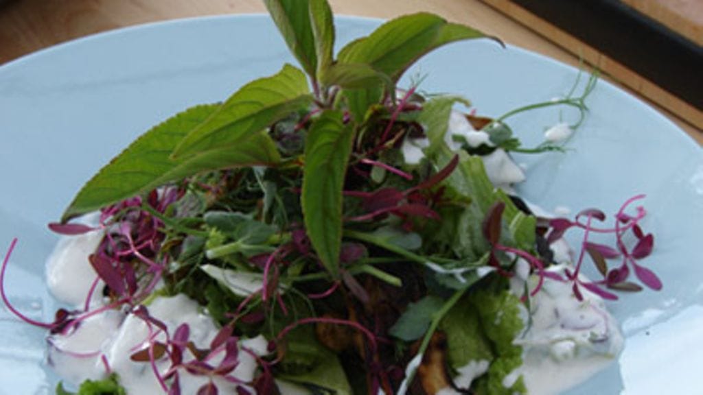 Siisti ja viipaloi maa-artisokkaa tarpeesi mukaan. Ruskista pannulla tai grillissä. Revi käsin erilaisia salaatteja (vältä veistä, jotta salaatinreunat eivät tummenisi). Sekoita kermaviiliin amaranttia ja minibasilikaa makusi mukaan. Mausta kermaviilikastike sitruunamehulla ja lorauksella kylmäpuristettua rypsiöljyä. Lisää myös ripaus suolaa ja pippuria kastikkeeseen. Sekoita hyvin. Aseta maa-artisokan viipaleet, erilaiset salaatit ja yrtit (esimerkiksi verisuolaheinää, herneenversoja ja ananassalviaa) lautaselle ja koristele kermaviilikastikkeella.