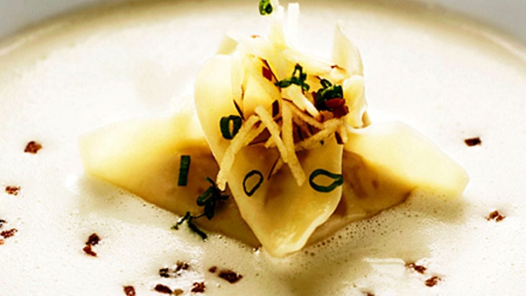 Kuori ja viipaloi maa-artisokat ja perunat. Kuori ja hienonna sipuli ja paista sipulisilppu kattilassa. Lisää raastettu peruna ja maa-artisokka, kaada päälle liemi ja viini. Kuumenna kiehuvaksi ja anna poreilla 15 minuuttia. Kaada päälle maito ja kerma, anna kiehua hieman kokoon. Sekoita keitto tasaiseksi sauvasekoittimella ja siivilöi. Kaada keitto takaisin kattilaan ja keitä vielä muutama minuutti. Mausta suolalla ja pippurilla.