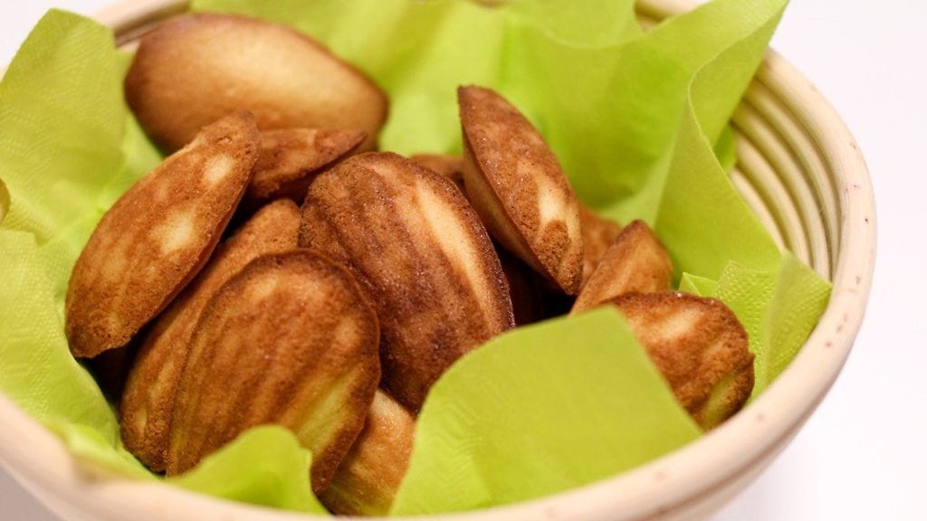 5. Voitele madeleinevuoat kevyesti, lisää seos lusikalla muotteihin, paista 200-asteisessa uunissa noin 11-12 minuuttia.