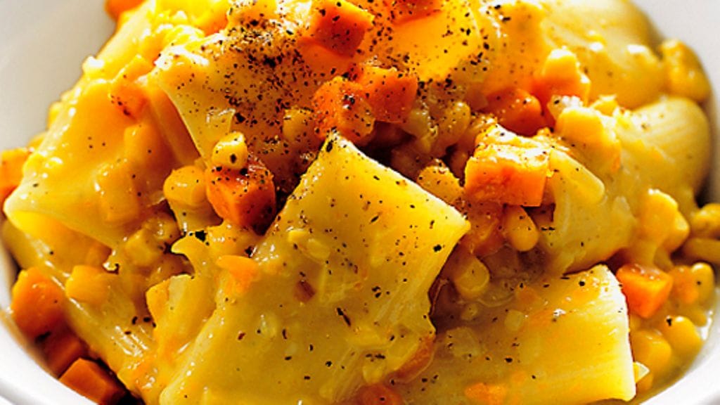 2. Paloittele kurpitsa sentin kuutioiksi ja hienonna sipuli. Kuullota kurpitsa, maissi ja sipuli voissa kookkaassa paistinpannussa. Kaada päälle lihaliemi ja anna hautua viiden minuutin ajan. Sekoita joukkoon parmesaaniraaste.