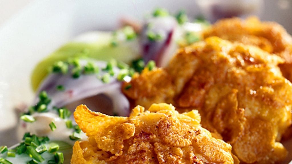 1. Leikkaa puoliksi sulanut kalatiili 1 ½ sentin viipaleiksi. Murskaa maissihiutaleet morttelissa tai kaulimella muovipussissa. Sekoita maissimurujen kanssa vehnäjauho, suola ja pippuri. Vatkaa muna.