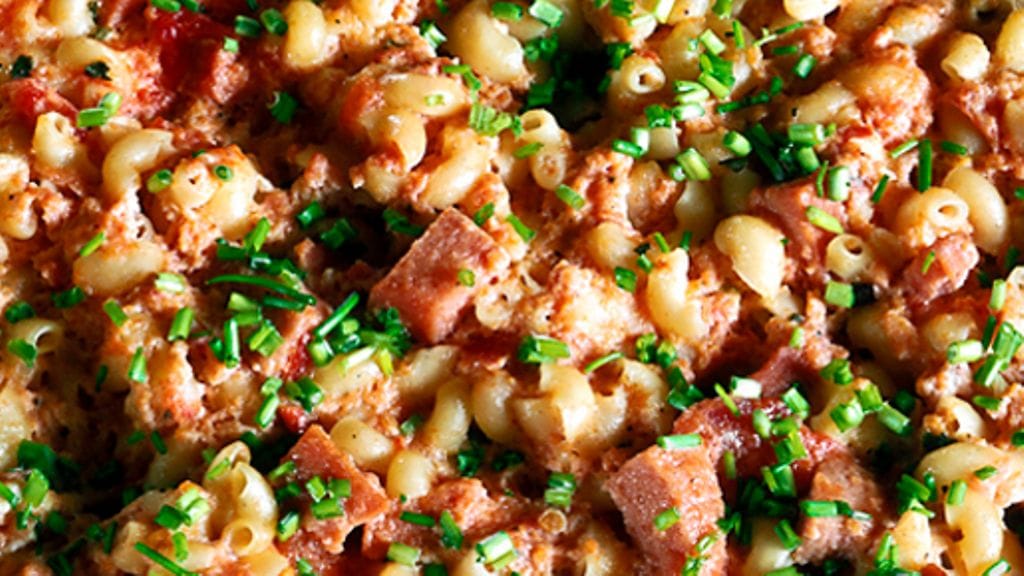 2. Kääntele mukaan raa'at makaronit, makkara sekä juusto. Mausta.