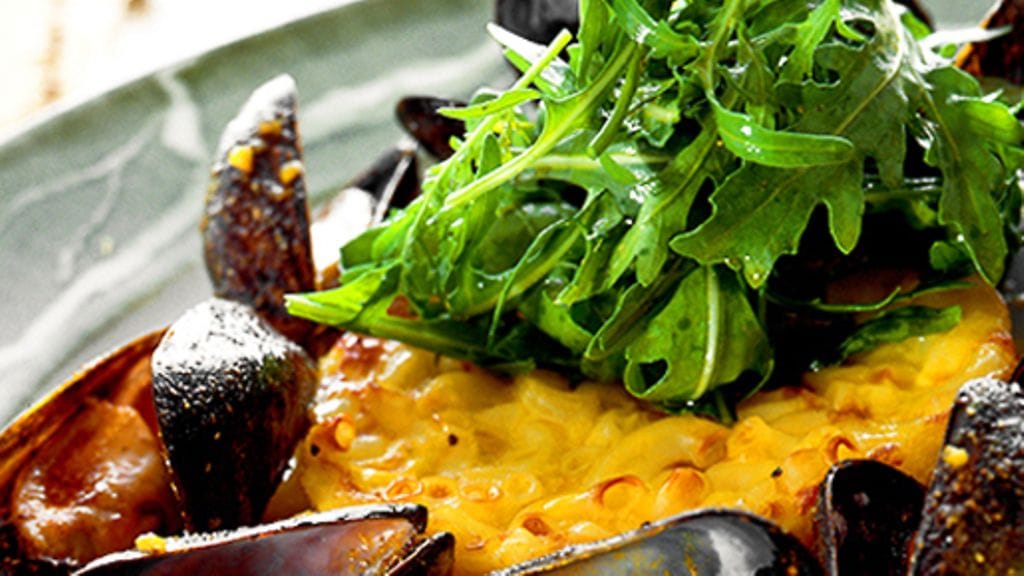 3. Asettele simpukat kauniisti tarjolle vanukkaan kera. Koristele rucolalla.