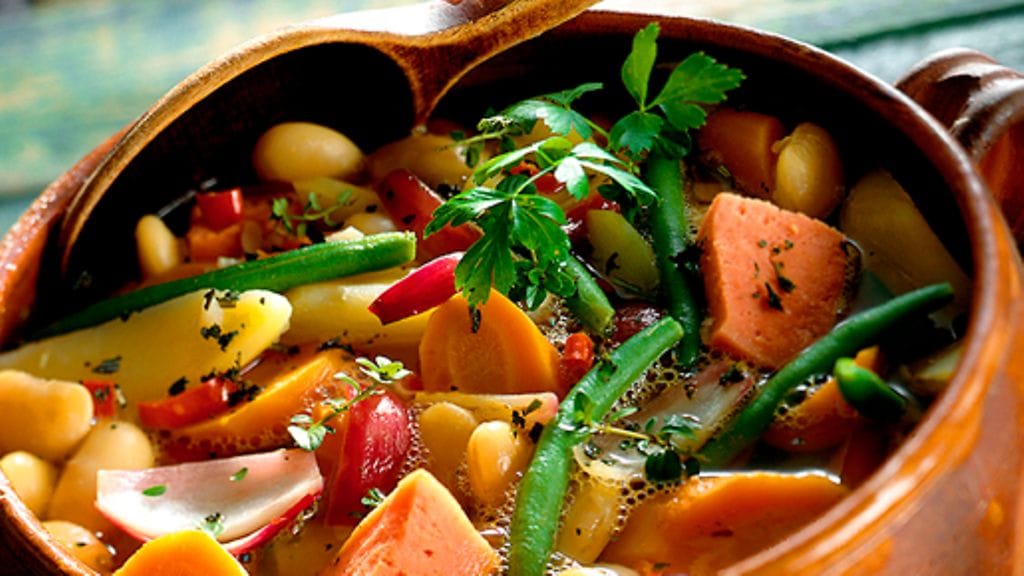 3. Lisää kattilaan makkarapalat, punasipuli, valkoiset pavut ja vihreät pavut. Mausta suolalla ja pippurilla ja keitä vielä 5 minuuttia. Kokeile, että perunat ovat läpeensä kypsiä. Koristele lehtipersiljalla ja tarjoile heti.