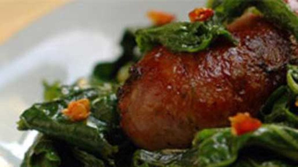 - Yhdistä paistetut makkarat ja lehtivihannes ja paista yhdessä muutaman minuutin ajan. Tarjoile kuumana.
