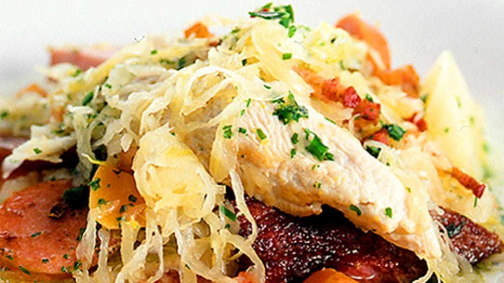 2. Lisää hapankaali, liemi ja mausteet pataan. Kuumenna kiehuvaksi, alenna lämpöä ja hauduta kannen alla n. 40 minuuttia. Lisää tarvittaessa lientä.