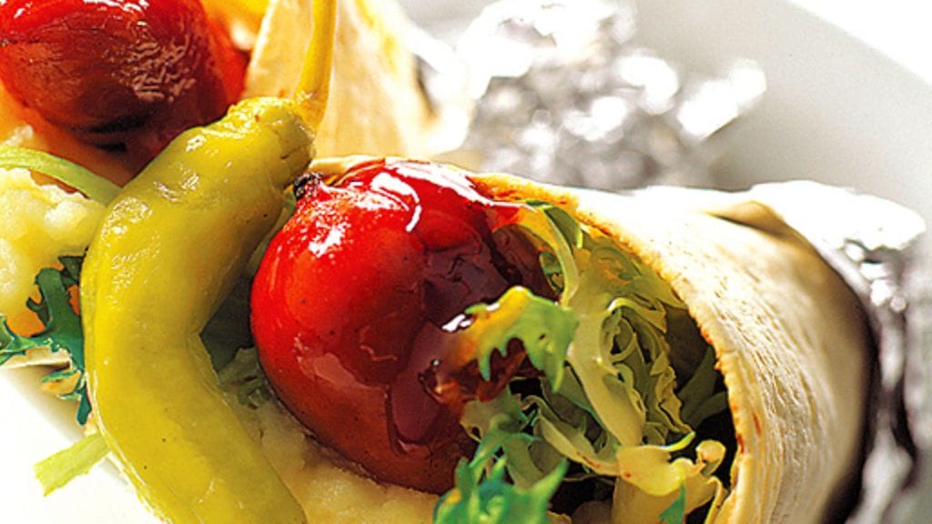 3. Aseta rieskat pöydälle. Levitä rieskalle kerros muusia, pane päälle makkara ja ripaus kurkkusalaattia.