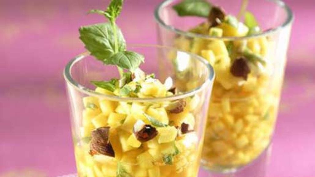 Tuoreista mangoista syntyy tyylikäs jälkiruoka, joka tarjoillaan korkeista laseista.