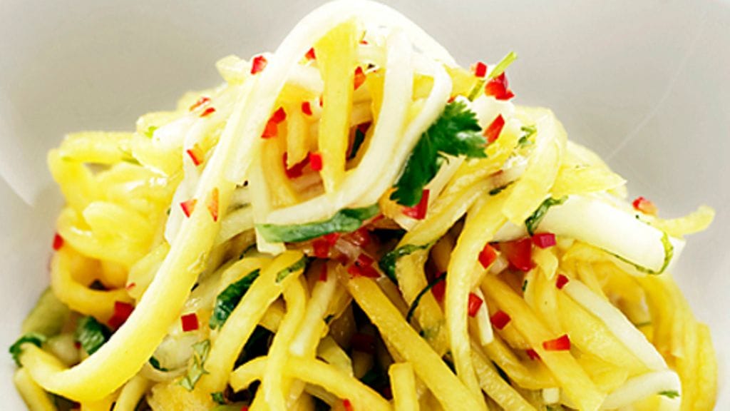 1. Kuori mango perunankuorimisveitsellä. Halkaise se siementä pitkin ja viipaloi hedelmä. Suikaloi lähes tulitikun ohuiksi suikaleiksi. Kuori ja halkaise kurkku, raaputa siemenet pois ja suikaloi samoin kuin mango. Halkaise chili, poista siemenet ja silppua pieneksi.