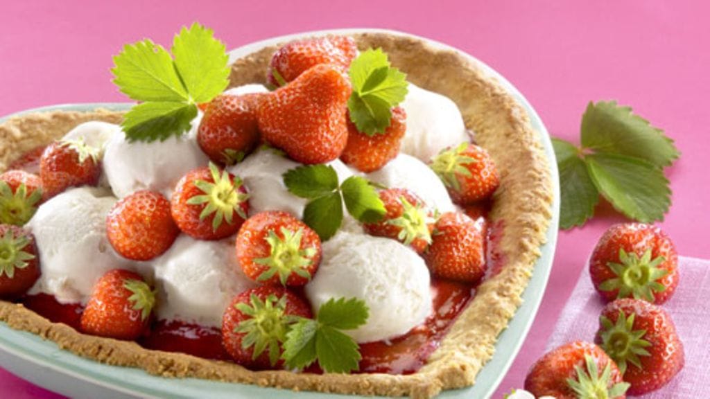 Kostuta jäähtynyt pohja mehulla. Levitä päälle mansikkasurvos tai hillo. Ota jäätelöstä palloja tai paloja ja lado ne nopeasti tortun päälle. Mikäli et tarjoile torttua heti, säilytä se pakastimessa tarjoiluun asti. Koristele mansikoilla ennen tarjoilua.