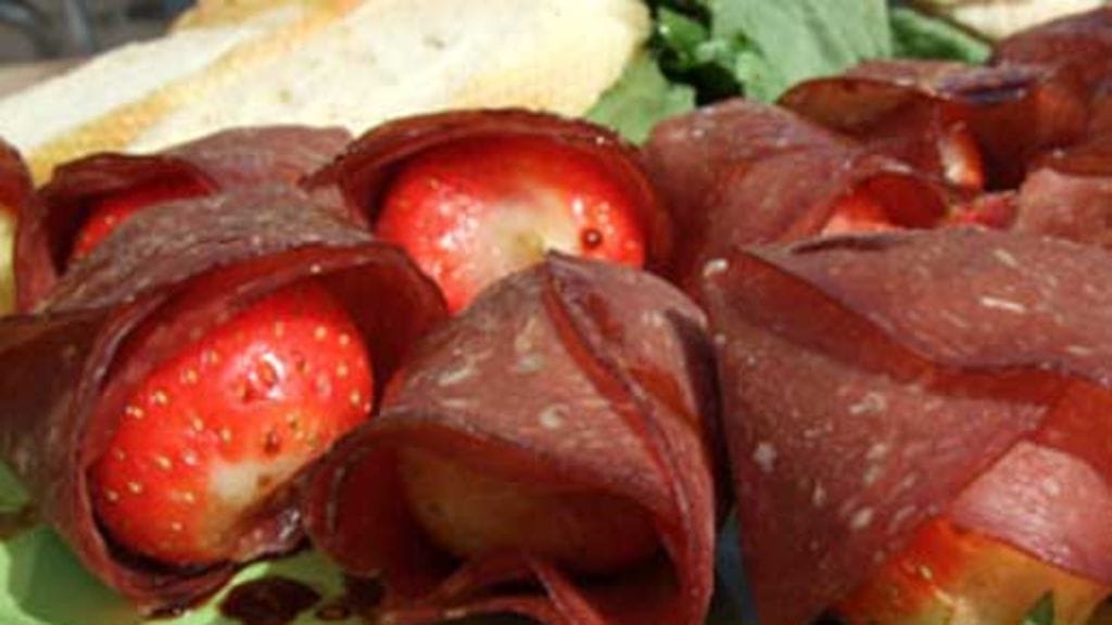 Poista mansikoista kannat ja kääräise marjat kylmäsavuhärkärullien sisään.