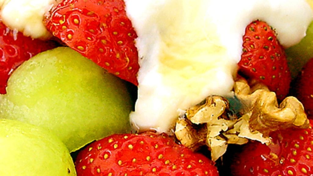 3. Lusikoi päälle jogurtti ja valuta pinnalle hunajaa, koristele saksanpähkinöillä.