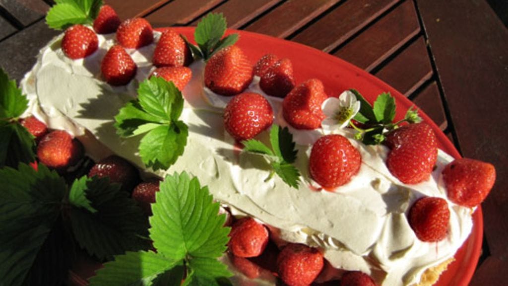 Vaahdota kerma ja sekoita täytteen aineet keskenään. Levitä mansikkasurvos ensin tortulle ohueksi kerrokseksi ja sitten päälle rahkaseos. Rullaa kääretortuksi jättäen sauma alaspäin.