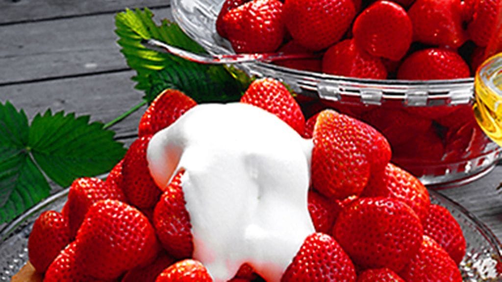 3. Asettele kakun päälle tuoreita, perattuja mansikoita ja tarjoile kermavaahdon kera.