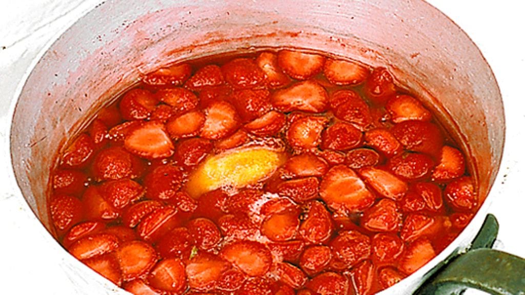 2. Kuumenna kiehuvaksi vesi, mansikat, sitruunankuori, vanilja ja sokeri. Purista joukkoon mehu sitruunalohkosta. Anna kiehua hiljaa vajaat 5 minuuttia. Ota vaniljatanko pois kattilasta.