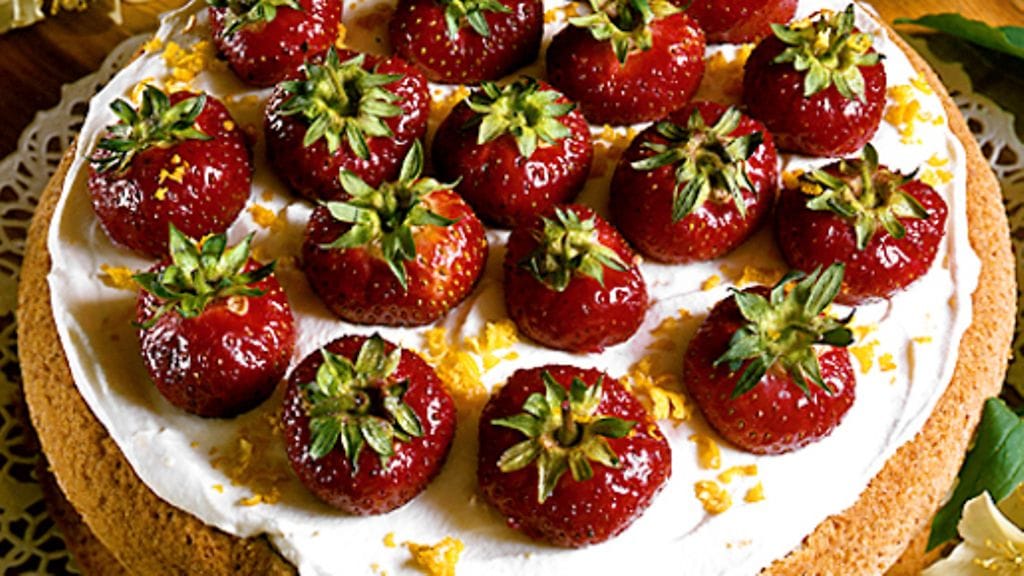 5. Laita puolet kermasta pohjien väliin ja loput kakun päälle. Laita kermaan mansikoita, ripottele päälle appelsiininkuorta.