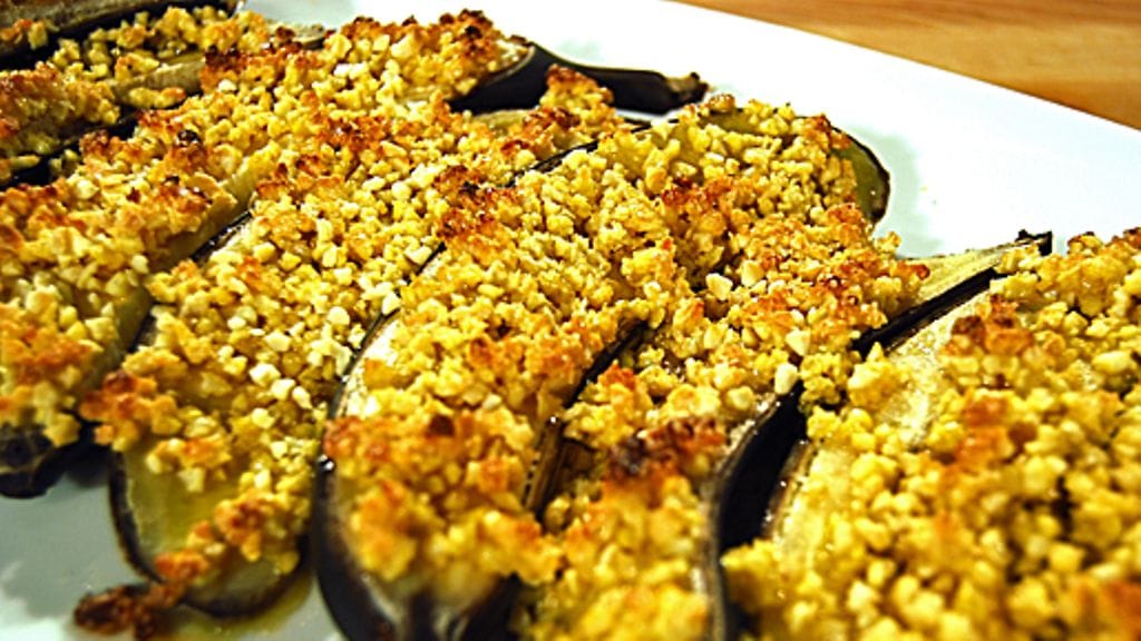 Halkaise banaanit ja asettele ne kuoret alaspäin uunivuokaan. Sekoita kulhossa mantelirouhe, sokeri, sekä keltuainen keskenään ja lusikoi banaanien päälle.