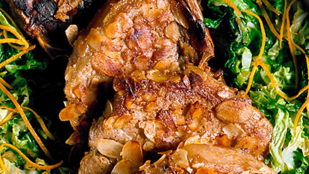 4. Paista salaattia tilkassa voita pannussa. Kääntele mukaan appelsiininkuori, mausta soijalla. Kaada päälle liemi ja asettele salaatti kyljysten ympärille.