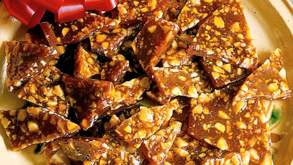 2. Kaada massa öljytylle pellille. Anna jäähtyä ja murra palasiksi.