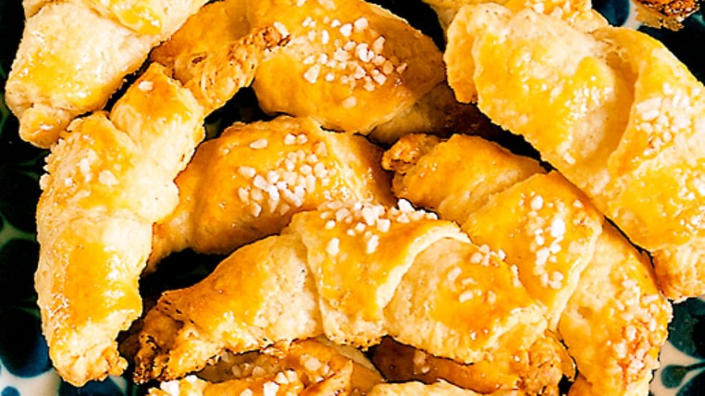 3. Laita sarvet leivinpaperille pellille. Penslaa munalla, ripottele päälle raesokeria. Paista uunin keskitasolla n. 10 minuuttia.