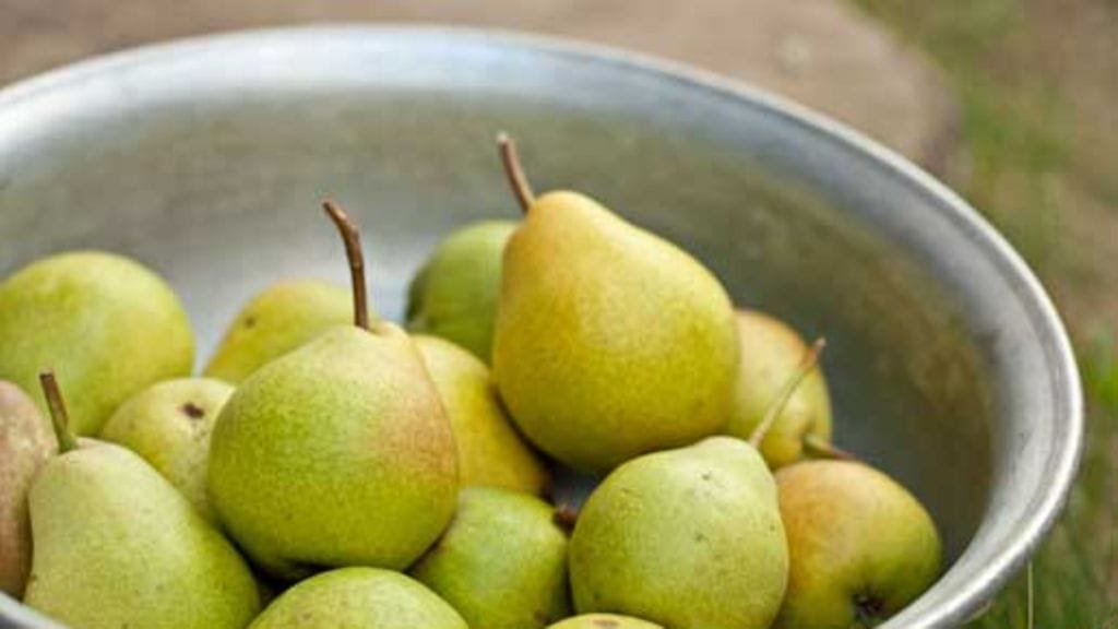 2. Kuumenna uuni 250 asteeseen. Valuta päärynänpuolikkaat ja laita ne uuninkestävään vuokaan. Raasta mantelimassa karkeasti, täytä päärynänpuolikkaiden keskustat mantelimassalla ja peitä minttusuklaalla.