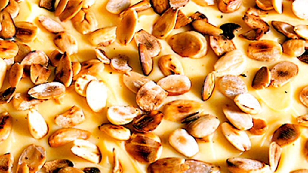 3. Levitä puolet täytteestä toiselle pohjalle. Laita toinen pohja sen päälle ja levitä loput täytteestä sen päälle. Paahda mantelilastut kuivassa pannussa. Sirottele tortun pinnalle koristeeksi.
