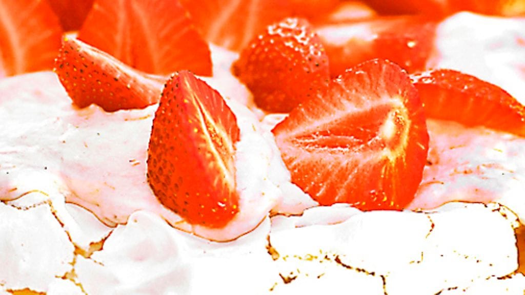 4. Levitä juuri ennen tarjoilua mansikkakerma marenkipohjille ja nosta ne päällekkäin. Koristele mansikanpuolikkailla ja tarjoile heti. Marenki pehmenee nopeasti ja sitkistyy, jos se joutuu odottelemaan pitkään syömistä.