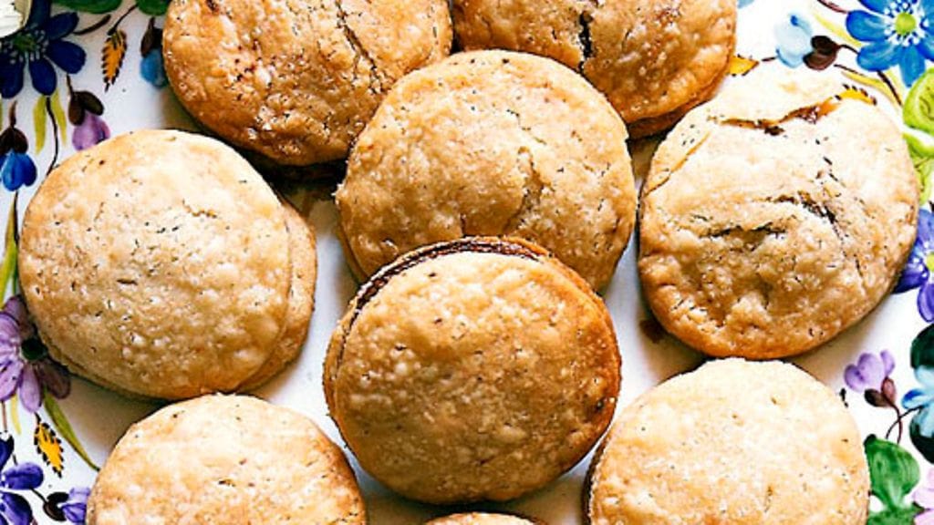 3. Kauli puolet taikinasta. Ota muotilla pyöreitä pikkukakkuja ja nosta ne leivinpaperilla peitetylle pellille. Jaa täyte pyörylöille.
