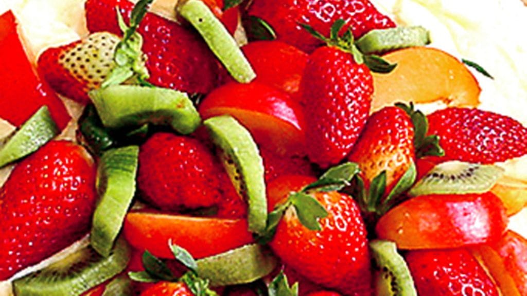4. Levitä vaniljakreemi valmiille marenkipohjalle juuri ennen tarjoilua. Koristele mansikanpuolikkain, luumulohkoin ja kiiviviipalein. Tarjoile heti. Jos säästät torttua, marenki pehmenee ja sitkistyy.