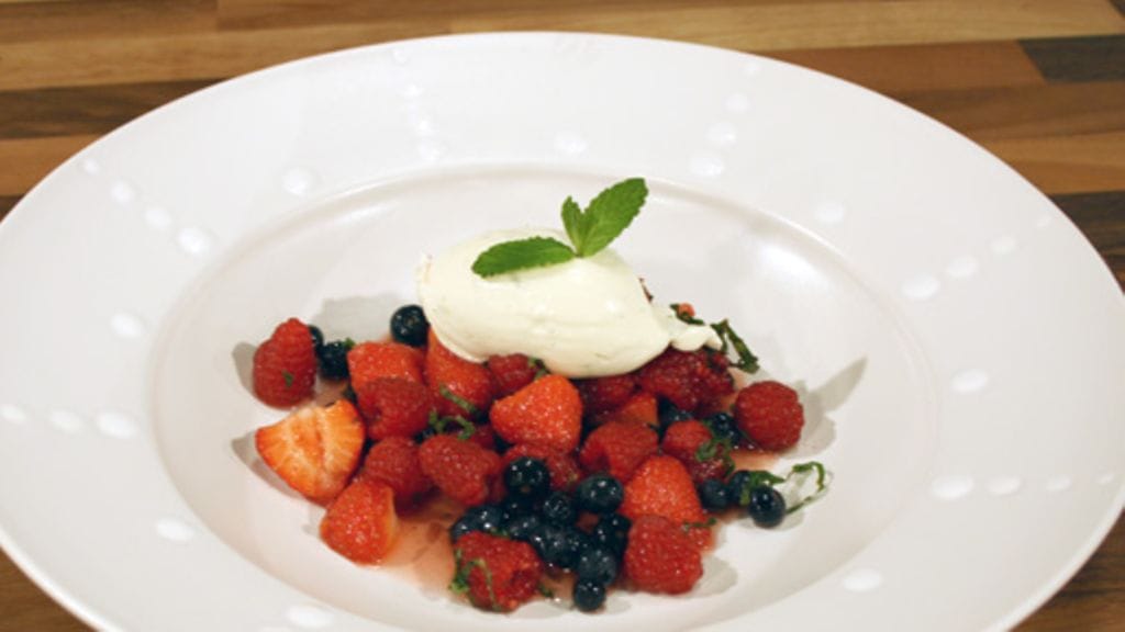 Marjat: Puhdista marjat ja leikkaa isot marjat puoliksi. Sekoita marjat liköörin, mintun lehtien, appelsiinimehun, sokerin ja pippurin kanssa. Anna marinoitua kylmässä tunnin verran.