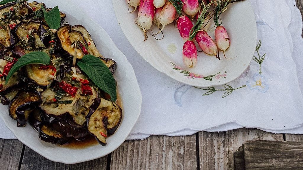 - Pirskottele viipaleille tilkka oliiviöljyä ja paahda munakoisoviipaleita 220-asteisessa uunissa 20–30 minuuttia, tai kunnes ne ovat saaneet kunnolla väriä.