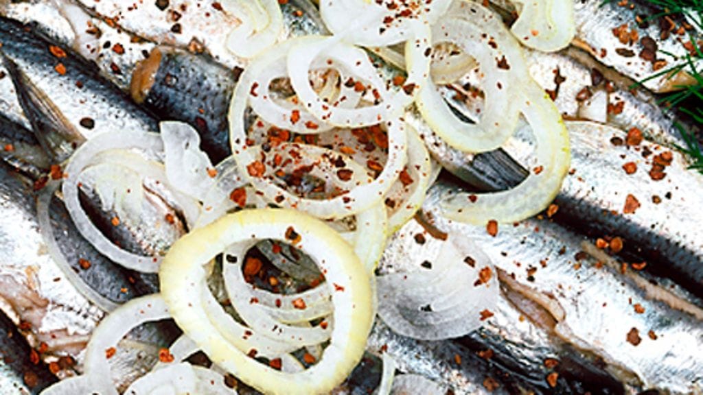 2. Nosta kalat liemestä ja valuta. Sekoita mausteseos. Laita kalat selkäpuoli ylöspäin kulhoon vuorotellen mausteiden ja sipulin kera. Laita päälle vati, joka mahtuu kulhoon, ja laita sen päälle paino. Anna maustua kylmässä 2 vuorokautta. Tarjoile tuoreen sipulin ja tillin kera.