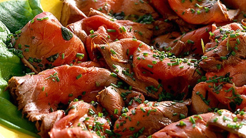 3. Ennen tarjoilua ota paisti marinadista ja leikkaa se viipaleiksi. Asettele viipaleet kauniisti salaattipedille. Vatkaa öljy, viinietikka, sinappi, suola, pippuri ja silputtu basilika kastikkeeksi. Kaada kastike lihaviipaleille juuri ennen tarjoilua ja silppua päälle ruohosipulia.