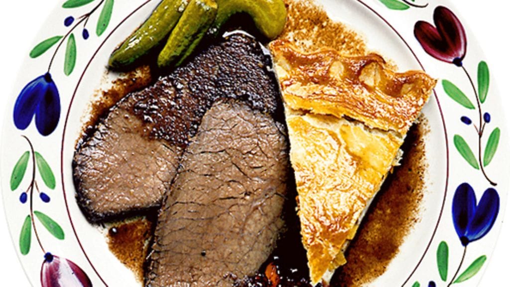 2. Kuori ja silppua sipuli karkeasti. Murskaa katajanmarjat morttelissa. Nosta paisti viinistä ja valuta lävikössä. Säästä viini jatkokäyttöön. Suolaa ja pippuroi paisti ja ruskista sitä voissa ympäriinsä. Paista sipulisilppu kullanruskeaksi voissa. Sekoita tomaattipyree viinitilkkaan, kaada seos sekä loppu marinointiviinistä pataan yhdessä valkosipulin, timjamin, katajanmarjojen ja suolan kanssa. Anna porista muutama minuutti. Nosta sitten paisti pataan ja keitä sitä hiljalleen miedohkolla lämmöllä noin 1 ½ tuntia.